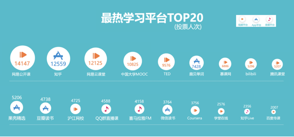 值得注意的是,TED、Bilibili這類非傳統(tǒng)意義教育資源提供者也進入了學習者視野,躋身前十,同樣受到了知識青年們的追捧。微課、喜馬拉雅FM等音頻平臺和知乎、扇貝單詞等App產(chǎn)品,也成為了在線學習者的重要知識獲取渠道。