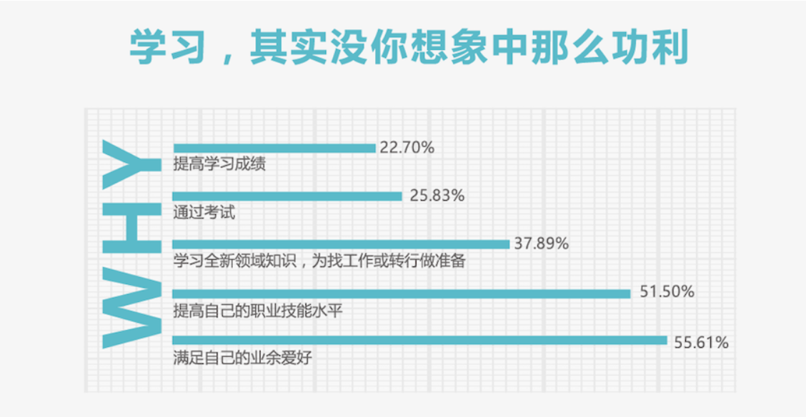 對于大多數(shù)學習者,興趣愛好培養(yǎng)和職業(yè)技能的提升是選擇在線學習的主要原因。提高學習成績及通過考試這類傳統(tǒng)學習方式催生的需求,在互聯(lián)網(wǎng)時代下或不適用,即使在學生群體中仍不是重要因素。