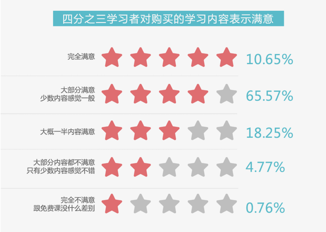 從人們對購得學習產(chǎn)品滿意度來看,內(nèi)容質(zhì)量得到了大多數(shù)知識消費者認可。取悅消費者不易,學習者愿意付錢,或促進了高質(zhì)量的學習內(nèi)容供給。