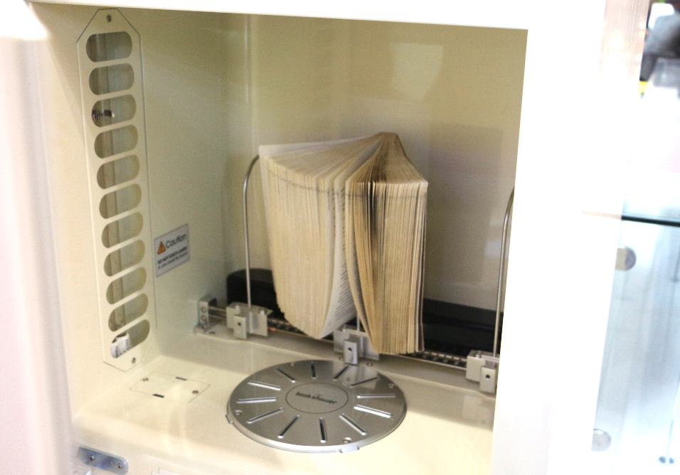 這是一款圖書消毒機(jī),使用方式類似微波爐,把書放進(jìn)去、合上柜門、等待一分鐘,您的書可以開始“享用”了。