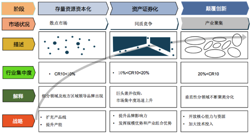 資產(chǎn)證券化階段,細(xì)分領(lǐng)域的龍頭企業(yè)通過(guò)并購(gòu)的方式規(guī)模迅速擴(kuò)大。 CR10 10%-20%之間,進(jìn)入條塊化、同質(zhì)化的競(jìng)爭(zhēng)階段,在這一時(shí)期的行業(yè)集中度上升,企業(yè)的發(fā)展戰(zhàn)略是提升品牌影響力,發(fā)揮規(guī)模和產(chǎn)業(yè)組合的優(yōu)勢(shì)。