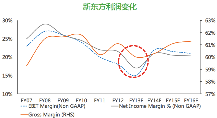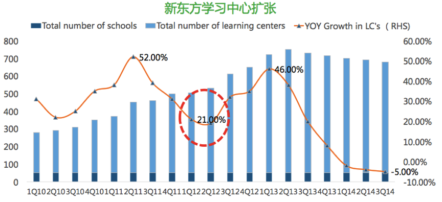 把2005年-2016年在美國(guó)上市公司財(cái)務(wù)數(shù)據(jù)做一個(gè)整體研究,我們會(huì)發(fā)現(xiàn)在2012年前后教育類的上市公司財(cái)務(wù)結(jié)構(gòu)發(fā)生了根本性的變化:2012年以前的營(yíng)收利潤(rùn),凈利潤(rùn)是在呈現(xiàn)上市趨勢(shì);但是在2012年前后,現(xiàn)了一個(gè)比較大的營(yíng)收和利潤(rùn)的下滑,擴(kuò)張步伐放緩。以新東方為例,2013年2季度學(xué)習(xí)中心的擴(kuò)張速度降到了歷史最低水平—21%,凈利潤(rùn)率降到20%以下。