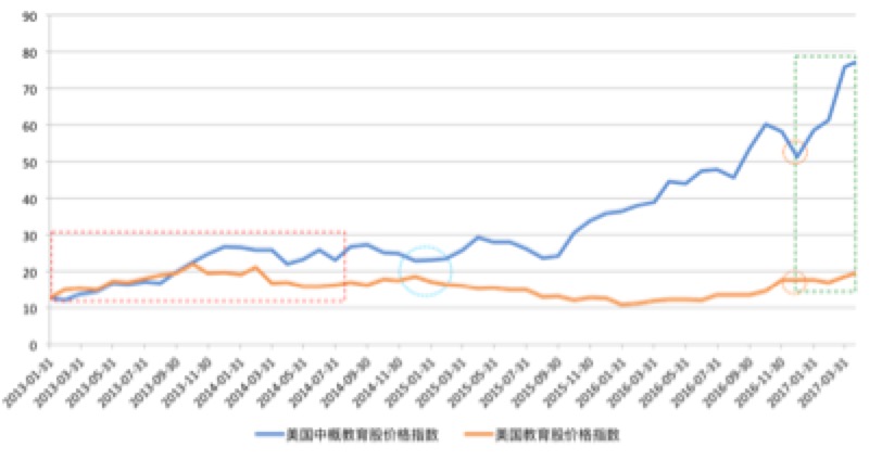 2015年的1月31號(hào)到2016年1月31號(hào)一年的時(shí)間,美國(guó)上市的教育企業(yè)股價(jià)指數(shù)持續(xù)下調(diào)。中國(guó)的教育類公司它的股價(jià)在持續(xù)上漲。2015年的1月是《民促法》一審稿提交的時(shí)間,正是由于這樣的一個(gè)制度性的變革,導(dǎo)致了美國(guó)和中國(guó)教育類公司股價(jià)出現(xiàn)了一個(gè)背離。第二個(gè)背離的最關(guān)鍵的時(shí)期是在2016年11月份,2016年7月份由于特朗普當(dāng)選,提出一些列刺激經(jīng)濟(jì)增長(zhǎng)的政策,利好美國(guó)股市,教育股也隨著大盤的走勢(shì)在往上走。