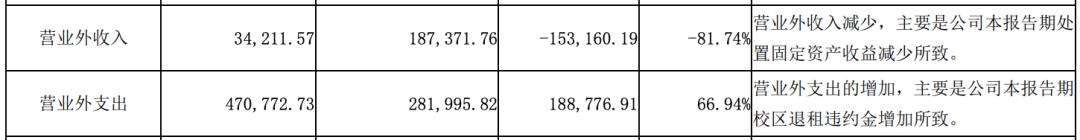 財報顯示,報告期內(nèi),紫光學(xué)大營業(yè)外收入減少81.74%,原因為報告期處置固定資產(chǎn)收益減少;而營業(yè)外支出增加66.94%,原因為校區(qū)退租違約金增加。