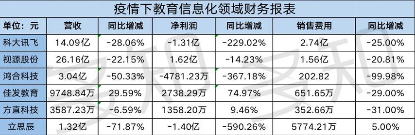 教育信息化企業(yè)在疫情期間也算是受益的一方。但是,由于學(xué)校停課,各家給予公立學(xué)校的業(yè)務(wù)支持均為公益活動,因此,營收和利潤方面并未在當(dāng)季中體現(xiàn)。從6家公司業(yè)績來看,僅佳發(fā)教育實現(xiàn)營收同比增長,且在報告期內(nèi)實現(xiàn)盈利。