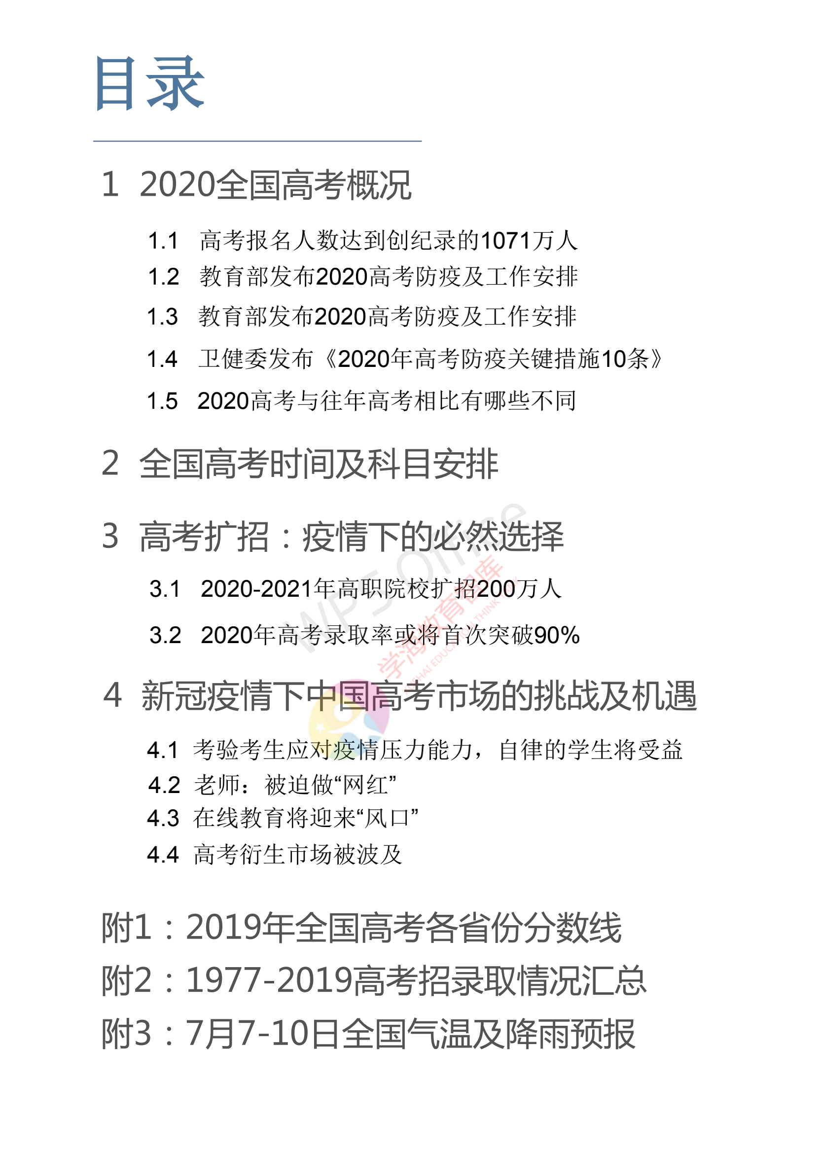 報(bào)告分別從2020全國(guó)高考概況、全國(guó)高考時(shí)間及科目安排、高考擴(kuò)招:疫情下的必然選擇三個(gè)章節(jié)入手,繼而探討新冠疫情下中國(guó)高考市場(chǎng)的挑戰(zhàn)及機(jī)遇。