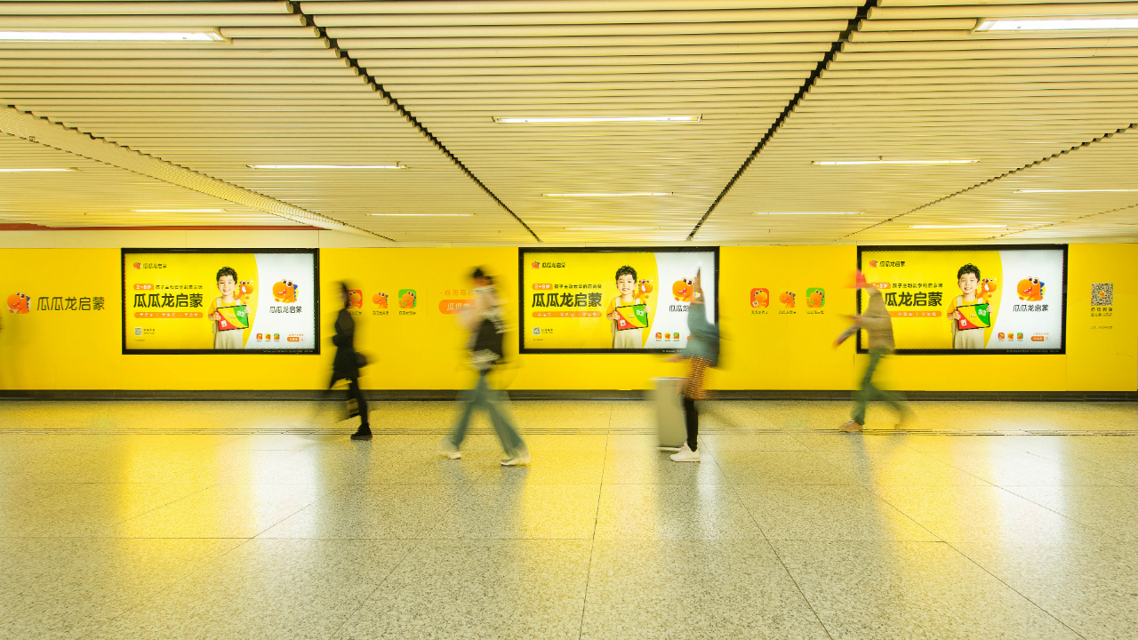 2、地面投放:從暑期開始,瓜瓜龍啟蒙出現(xiàn)在一線城市的核心地鐵站和地鐵車廂,通過品牌墻、電子屏互動(dòng)和人行通道地面海報(bào)曝光等形式,在地面戰(zhàn)場(chǎng)進(jìn)行品牌輸出。