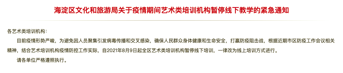 以下為海淀區(qū)關(guān)于疫情期間藝術(shù)類培訓(xùn)機(jī)構(gòu)暫停線下教學(xué)的緊急通知通知原文: