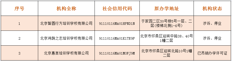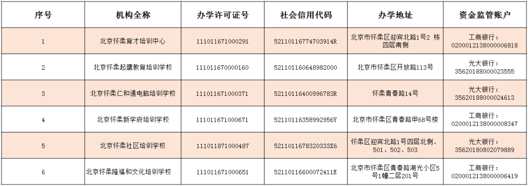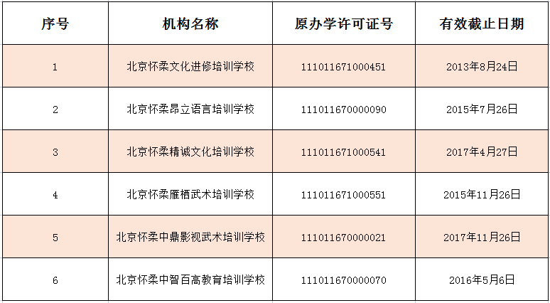 北京懷柔文化進修培訓(xùn)學(xué)校、北京懷柔昂立語言培訓(xùn)學(xué)校、北京懷柔精誠文化培訓(xùn)學(xué)校、北京懷柔雁棲武術(shù)培訓(xùn)學(xué)校、北京懷柔中鼎影視武術(shù)培訓(xùn)學(xué)校以及北京懷柔中智百高教育培訓(xùn)學(xué)校六家培訓(xùn)機構(gòu)已公告注銷。