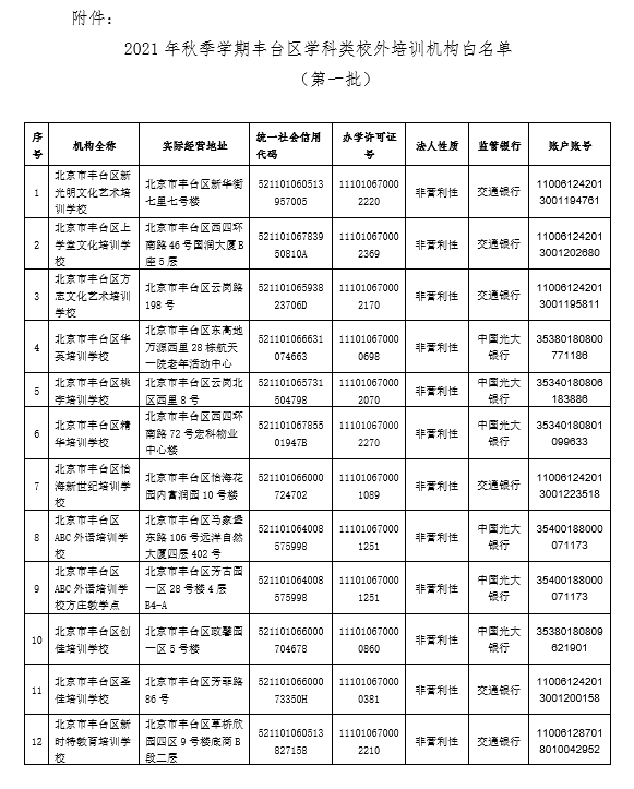 8月28日,北京市豐臺區(qū)教委公布2021年秋季學(xué)期豐臺區(qū)學(xué)科類校外培訓(xùn)機構(gòu)白名單(第一批),豐臺區(qū)新光明文化藝術(shù)培訓(xùn)學(xué)校等12家非營利性學(xué)科類校外培訓(xùn)機構(gòu)上榜。