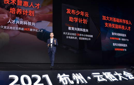 會(huì)上,張勇宣布阿里巴巴正式啟動(dòng)“少年云助學(xué)計(jì)劃”, 向10000所欠發(fā)達(dá)地區(qū)的中小學(xué)校捐建“云電腦機(jī)房”,助力改善欠發(fā)達(dá)地區(qū)中小學(xué)校的科技教育。這也是阿里巴巴助力共同富裕的又一具體行動(dòng)。9月初,阿里巴巴發(fā)布“助力共同富裕十大行動(dòng)”,包括“加大科技投入,扶持欠發(fā)達(dá)地區(qū)數(shù)字化建設(shè)”等。