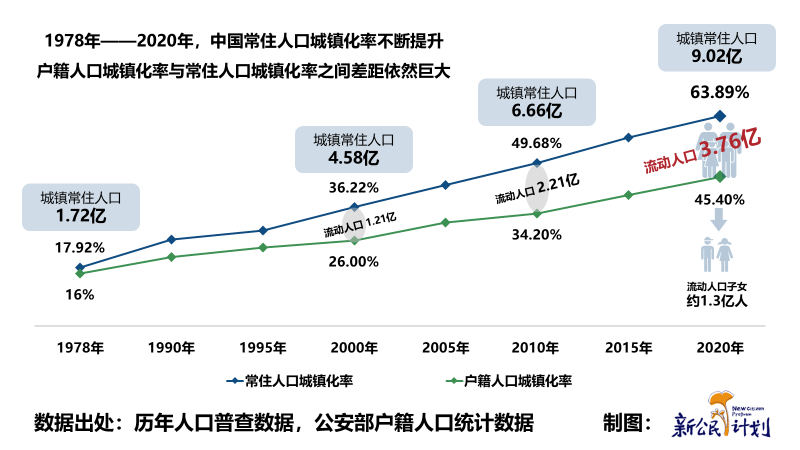 第七次全國人口普查數(shù)據(jù)顯示,2020年,中國城鎮(zhèn)常住人口9.02億,常住人口城鎮(zhèn)化率為63.89%,但是戶籍人口城鎮(zhèn)化率仍然只有45.4%,流動(dòng)人口有3.76億人,比美國的總?cè)丝?3.31億人)還要多。其中流動(dòng)人口子女約1.3億人,超過中國兒童總數(shù)的40%。
