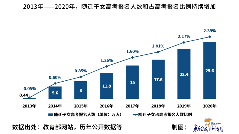 2013年,各省、自治區(qū)、直轄市“就地高考”政策陸續(xù)出臺(tái),隨遷子女在居住地參加高考人數(shù)逐年增加,2013年只有0.44萬隨遷子女在居住地報(bào)名參加高考,2020年,已經(jīng)有25.6萬人隨遷子女在居住地報(bào)名參加高考,占當(dāng)年高考報(bào)名人數(shù)的2.39%。