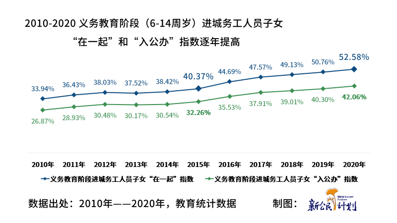 隨著流動(dòng)人口規(guī)模的增長,中國流動(dòng)人口子女規(guī)模同步增長,2020年,中國流動(dòng)人口子女規(guī)模約1.3億人(參考《2015年中國兒童人口狀況,事實(shí)與數(shù)據(jù)》,《第七次人口普查數(shù)據(jù)公報(bào)》,《2015年-2020年,教育統(tǒng)計(jì)資料》估算),超過中國兒童總數(shù)的40%。對(duì)于許多流動(dòng)人口家庭來說,把孩子帶在身邊成為流動(dòng)兒童,在居住地城市會(huì)面臨各種入學(xué)、升學(xué)方面的困難;送回“老家”成為留守兒童,就不能親自養(yǎng)育和陪伴孩子的成長,對(duì)于每個(gè)流動(dòng)中的家庭來說,“流動(dòng)”還是“留守”是一個(gè)兩難的選擇。