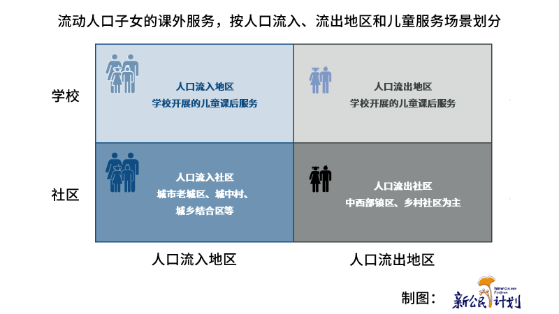 流動(dòng)人口子女的課外服務(wù),按照人口遷入和遷出,分為人口流入地區(qū)(以流動(dòng)兒童為主)和人口流出地區(qū)(以留守兒童為主);按照服務(wù)場(chǎng)景,分為在學(xué)校提供的服務(wù)和在社區(qū)提供的服務(wù)。“雙減”政策以來,教育部正在加大力度提升學(xué)校課后服務(wù)水平,因此本文將聚焦于討論社區(qū)場(chǎng)景,在人口流入地區(qū),流動(dòng)人口子女主要居住在老城區(qū)、城中村或城鄉(xiāng)結(jié)合區(qū);在人口流出地區(qū),則廣泛分布在中西部城鎮(zhèn)和鄉(xiāng)村地區(qū)。