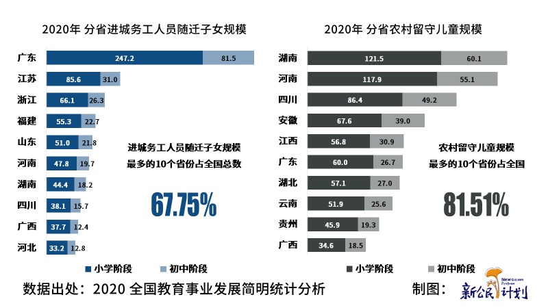 2020年,農(nóng)村留守兒童規(guī)模最多的10個(gè)省份分別是湖南、河南、四川、安徽、江西、廣東、湖北、云南、貴州和廣西,占中國農(nóng)村留守兒童在校生總數(shù)的81.51%?! ?/p>