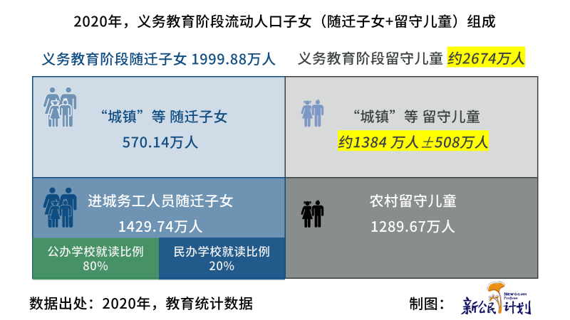 2020年,義務(wù)教育階段隨遷子女1999.88萬人,其中進(jìn)城務(wù)工人員隨遷子女1429.74萬人,進(jìn)城務(wù)工人員隨遷子女中,在公辦學(xué)校就讀的比例為80.0%。“城鎮(zhèn)”等隨遷子女(還包括少量遷入地是鄉(xiāng)村的隨遷子女)570.14萬人。