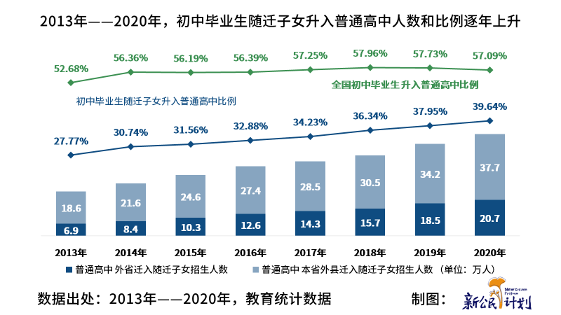 2013年——2020年,普通高中隨遷子女招生人數(shù)從25.5萬人逐年增長到58.4萬人,初中畢業(yè)生中隨遷子女在居住地升入普通高中的比例也從2013年27.77%逐年增長到39.64%,依然大幅低于全國初中畢業(yè)生升入普通高中的比例,這還沒有不考慮到很多隨遷子女受政策限制,無法在流入地參加中考,只能提早“返鄉(xiāng)”繼續(xù)就讀,而無法在居住地作為隨遷子女畢業(yè)的情況。