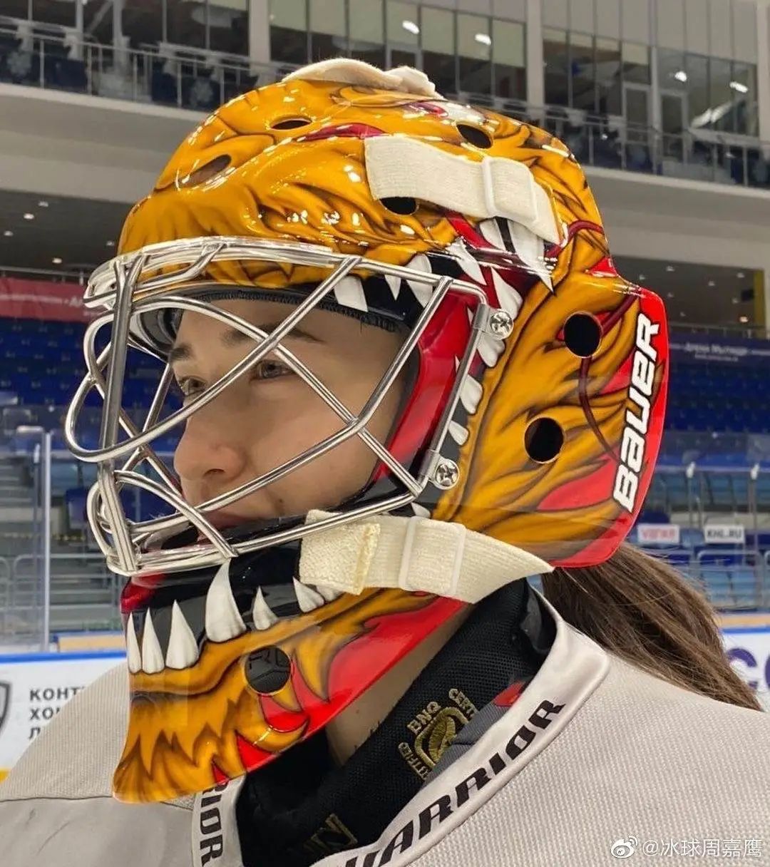 ■ 女子冰球隊(duì)門將周嘉鷹——龍紋頭盔、龍騰虎躍明墻盾。