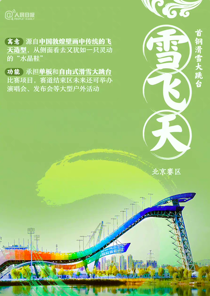 “雪飛天”的設(shè)計(jì)靈感來源于中國敦煌壁畫中的“飛天”,而“飛天”與滑雪大跳臺項(xiàng)目的英文“Big Air”一詞,都有向空中騰躍、飛翔的意思。因此,“雪飛天”既形象又貼切,且極具中國味。每到夜幕降臨,在各種燈光的裝扮下,它又能放射出迷人的色彩。