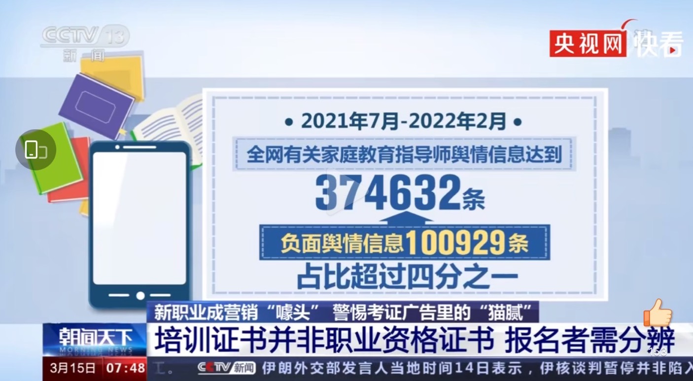 多知網(wǎng)3月15日消息,據(jù)央視網(wǎng)快看微博消息,近段時(shí)間以來,關(guān)于家庭教育指導(dǎo)師考證的廣告出現(xiàn)在不少網(wǎng)絡(luò)社交平臺(tái)上,有的機(jī)構(gòu)聲稱“家庭教育指導(dǎo)師全職一年收入幾十萬”,有的則打出廣告,稱這個(gè)行業(yè)“崗位缺口數(shù)百萬,拿下證書就有了金飯碗。”