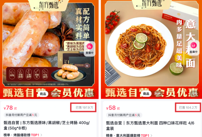至今,東方甄選在售的自營品產品已經達到52款。其中,“東方甄選自營烤腸”在抖音官方店鋪中的銷售量達到197.9萬,“東方甄選自營意大利面”的銷售量也已突破百萬。