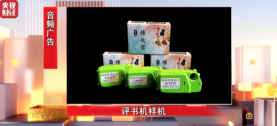 根據(jù)央視報(bào)道,“評(píng)書機(jī)”外觀看起來像收音機(jī),但這類收音機(jī)除了開關(guān)、音量、播放鍵外,沒有任何按鈕,并不具備收聽廣播的功能,里面只有一條音頻,大多時(shí)長(zhǎng)在4個(gè)小時(shí)以上。音頻內(nèi)容主要是一些冠有大名頭的專家、藥品研發(fā)人或是各種協(xié)會(huì)的會(huì)長(zhǎng)在介紹藥品的功能功效,還有工作人員接聽患者問診電話及使用效果的反饋,以及“患者”的感謝。