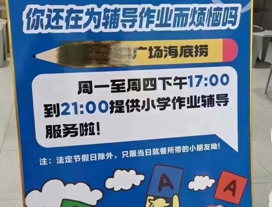 此外,海底撈相關(guān)負(fù)責(zé)人也回應(yīng)稱,是發(fā)海報的門店為用餐過程中有學(xué)習(xí)需求的孩子提供的學(xué)習(xí)空間,是在服務(wù)業(yè)范圍內(nèi)提供力所能及的幫助,并不涉及專業(yè)輔導(dǎo)和培訓(xùn)。