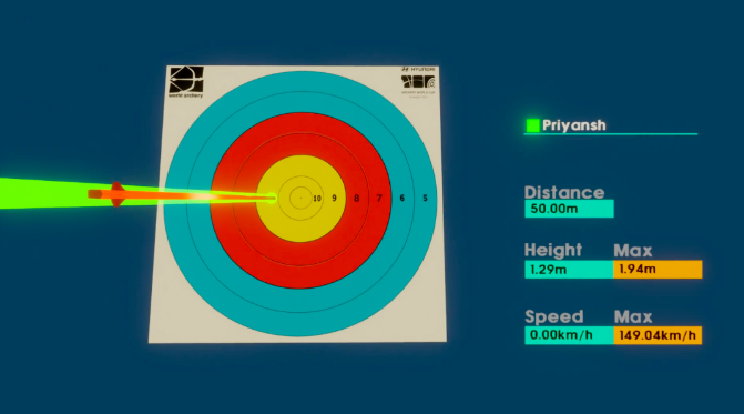 但實(shí)際上,箭矢運(yùn)動(dòng)中的過程也很重要,卻往往缺乏相應(yīng)的轉(zhuǎn)播語言。在射箭運(yùn)動(dòng)中,箭矢在離弦一剎那,會(huì)受到弓弦彈力影響而發(fā)生動(dòng)態(tài)彎曲,并導(dǎo)致在飛行過程中像魚一般左右擺動(dòng)。刮風(fēng)、下雨等天氣變化,也會(huì)影響箭矢的運(yùn)動(dòng)姿態(tài)。箭矢的最終飛行軌跡,決定了能否命中靶心。準(zhǔn)確感知風(fēng)速、精準(zhǔn)掌握力道,才能以最佳的最高點(diǎn)離地距離、速度和飛行距離這些關(guān)鍵技戰(zhàn)指標(biāo),制勝賽場。這些指標(biāo)也能很好地反映一名運(yùn)動(dòng)員的水平、技術(shù)特色、發(fā)揮穩(wěn)定性,以及面對不同環(huán)境的技戰(zhàn)術(shù)靈活性。