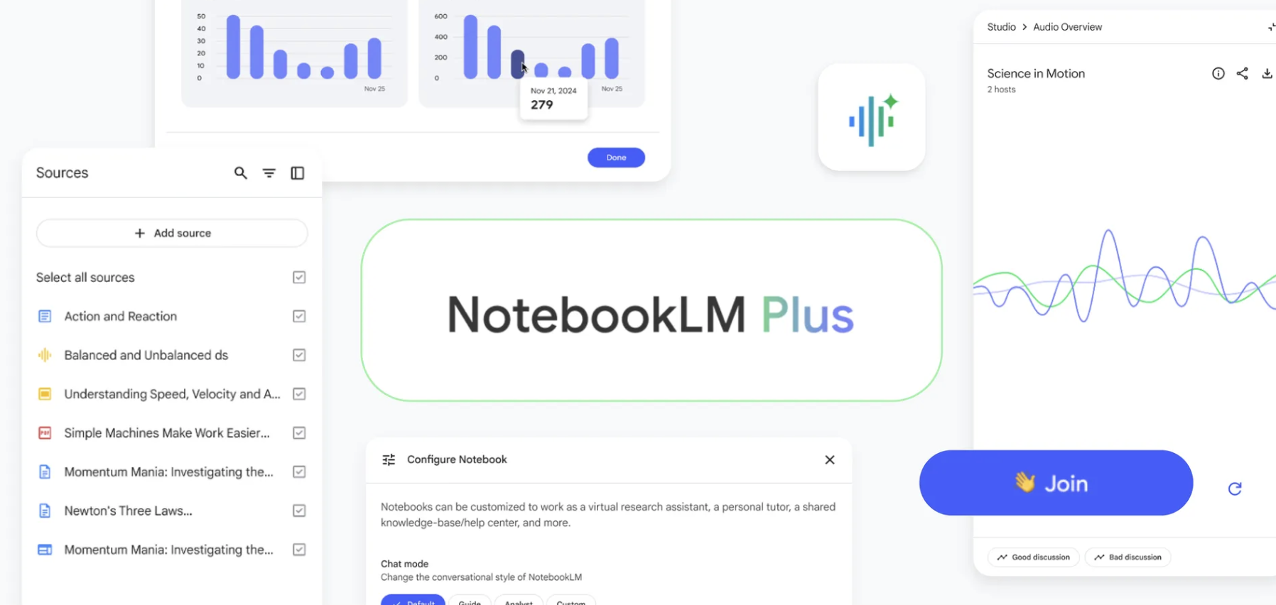 多知1月9日消息,谷歌旗下的NotebookLM更新,推出Gemini 2.0 Flash實(shí)驗(yàn)版本及更多更新,包括全新界面、在音頻播放期間直接與 AI 主持人互動(dòng)、以及推出付費(fèi)版NotebookLM Plus。