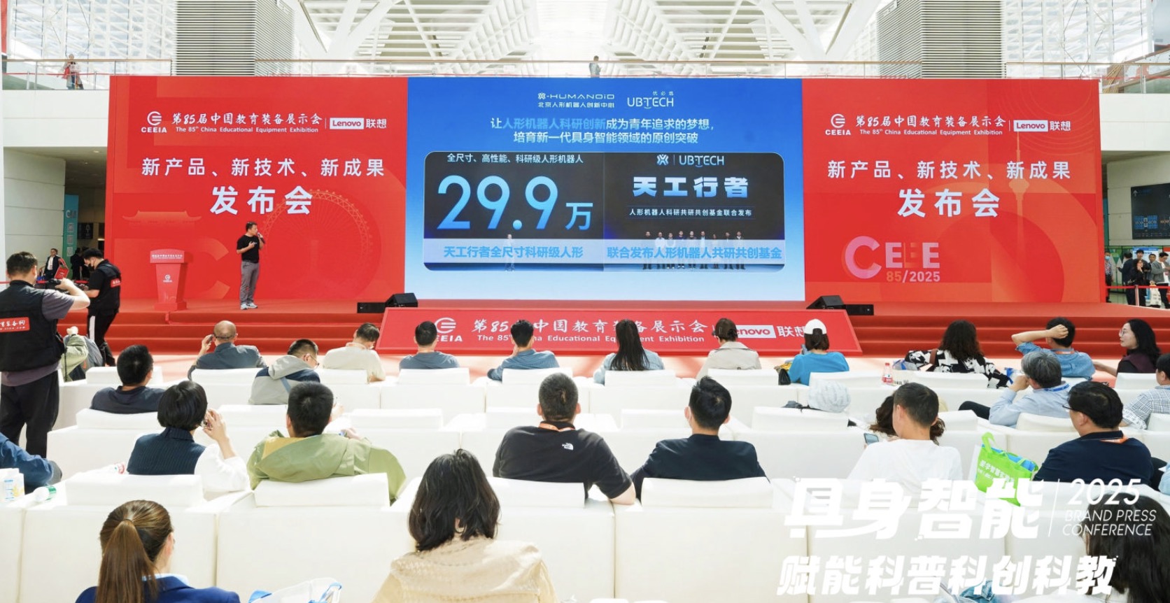 多知4月26日消息,第85屆教育裝備展示會在天津舉辦,優(yōu)必選以“具身智能賦能科普科創(chuàng)科教”為主題,展示了具身智能技術在教育領域的解決方案和落地場景,發(fā)布了全尺寸科研教育人形機器人“天工行者”。