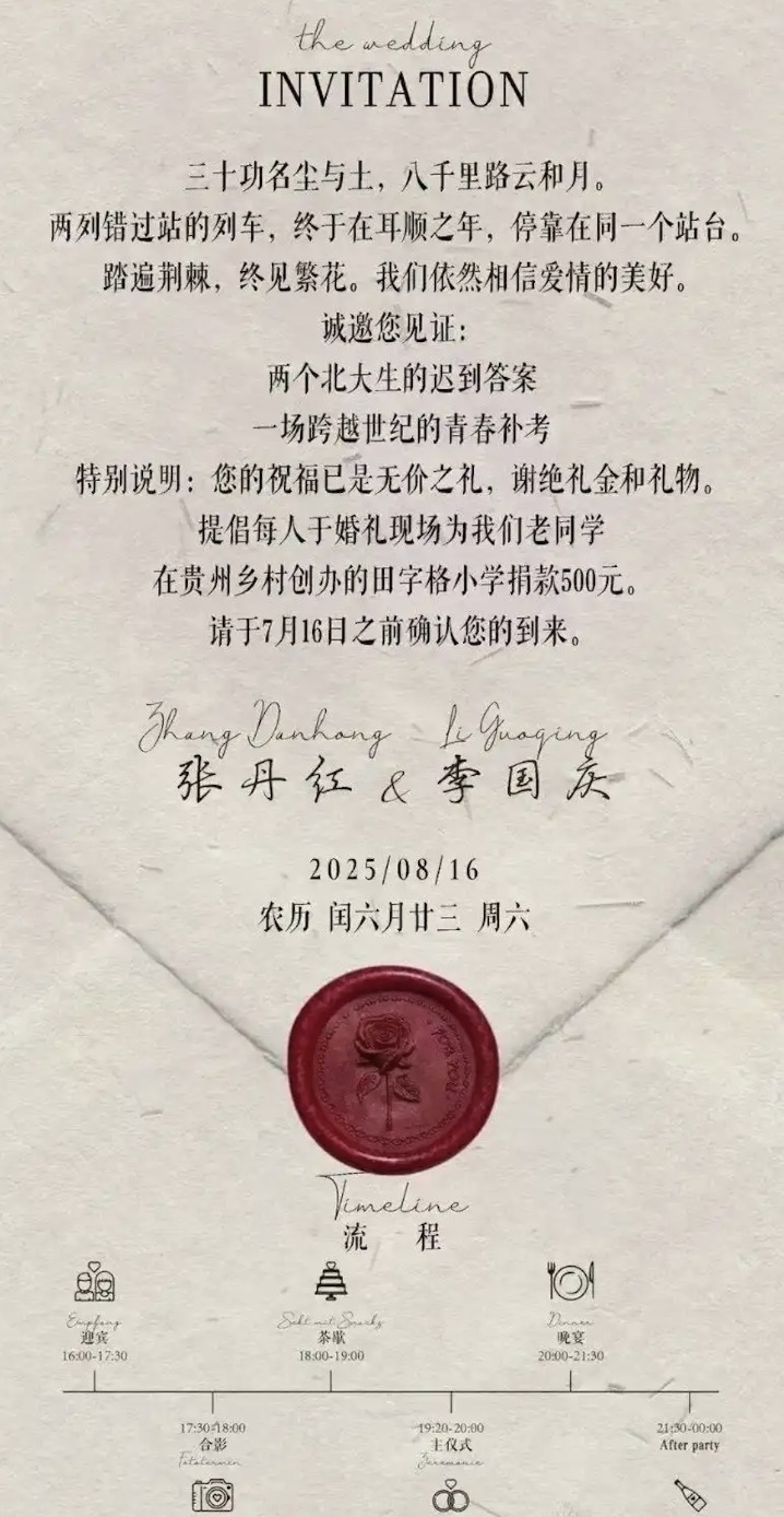 多知6月18日消息,有網(wǎng)友曬出李國慶與張丹紅的新婚請柬,婚禮將于2025年8月16日北京舉辦。李國慶的配偶為其北大校友張丹紅。