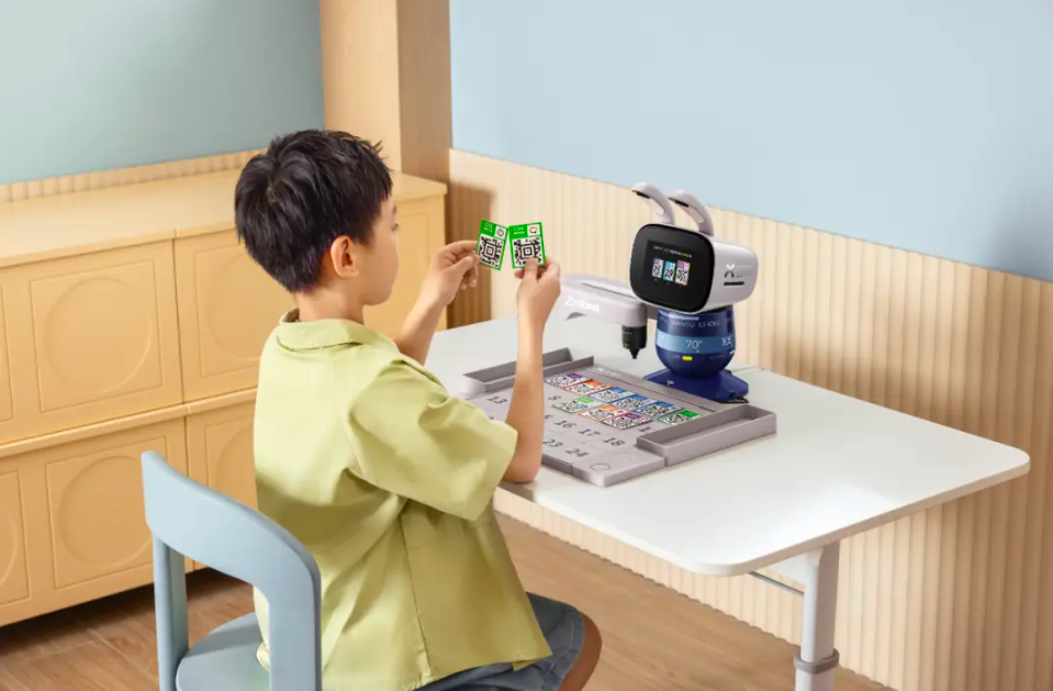 “(我們配備有)一張張小卡片,孩子可以跟著機(jī)器人的提示,將卡片擺放在棋盤上,進(jìn)而指揮機(jī)器人完成一系列特定的指令動(dòng)作。實(shí)體卡片意味著,孩子不需要盯著屏幕,只要擺在棋盤上,就可以既鍛煉邏輯訓(xùn)練,又呵護(hù)眼睛。機(jī)器人會(huì)根據(jù)指令教孩子,從簡單的怎么讓機(jī)器人揮揮手到復(fù)雜的組合式編程。零基礎(chǔ)的孩子只要跟著做,也能輕松上手。同時(shí)我們還有數(shù)字+語音的雙校驗(yàn)。孩子將卡片擺放到棋盤后,機(jī)器人就會(huì)識別不同的指令,告訴孩子正確與否,孩子慢慢就能在過程中培養(yǎng)出編程的思維。”閆雪具體闡釋了該功能。