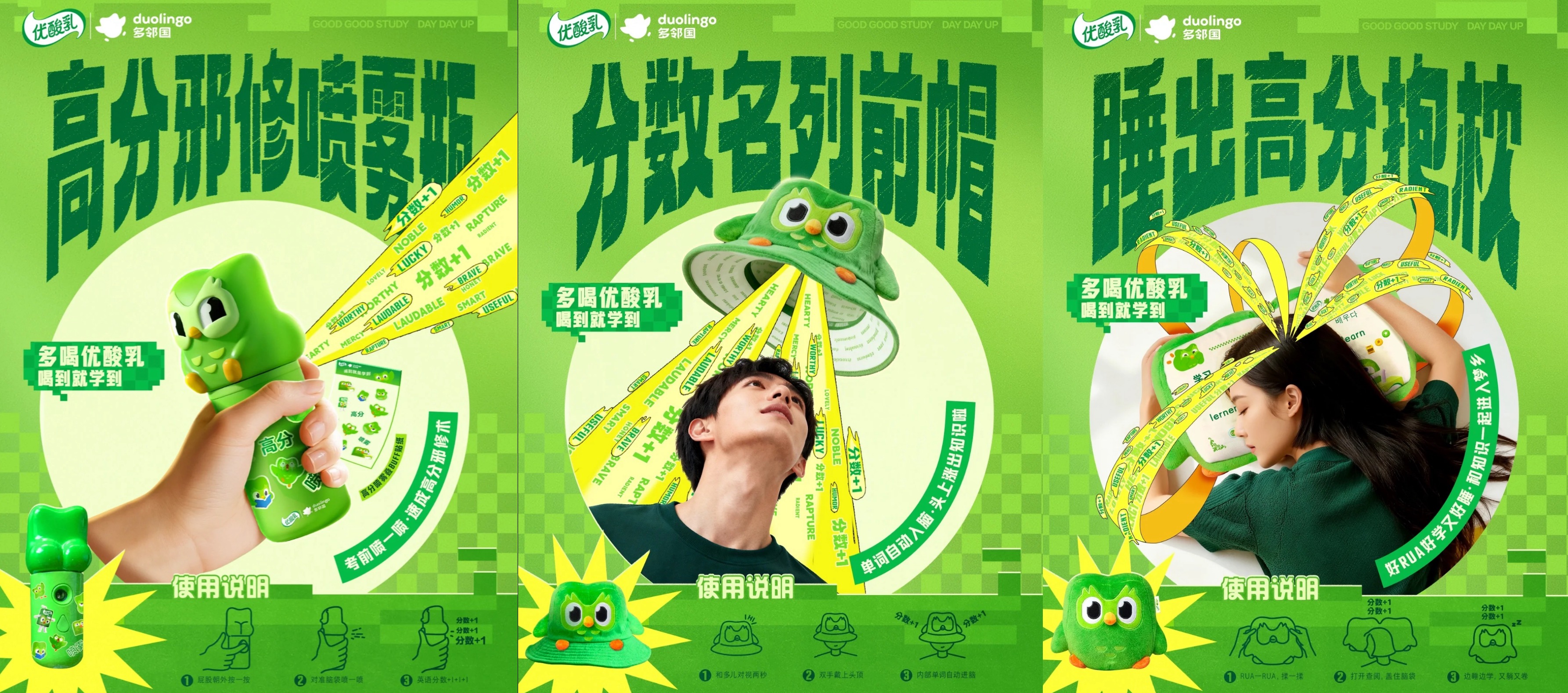 在優(yōu)酸乳小紅書賬號(hào)中,還曬出了“高分邪修噴霧”、“分?jǐn)?shù)名列前茅帽”、“睡出高分抱枕”等周邊。