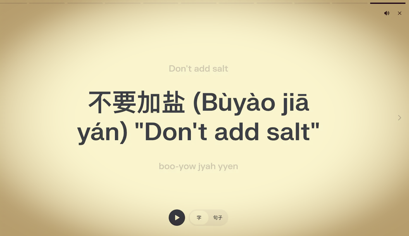 當(dāng)筆者輸入“learn Chinese about food”時,Perplexity很快給出了一些答案。當(dāng)點擊“炸”后,Perplexity會閃現(xiàn)出一張張關(guān)于食物的中文單詞和句子表達,并提供讀音和釋義。