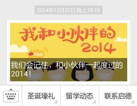 2014年,各個教育機構(gòu)取得了大大小小的成績,也舉辦了各式各樣的活動,在年末歲尾,官方微信除了發(fā)送恭賀新年展望未來的雞湯文章外,不少機構(gòu)也為這一年來的努力付出做了“年終總結(jié)”。有的展示榮譽成績,有的盤點創(chuàng)意活動,有的重在數(shù)據(jù),有的注重審美。