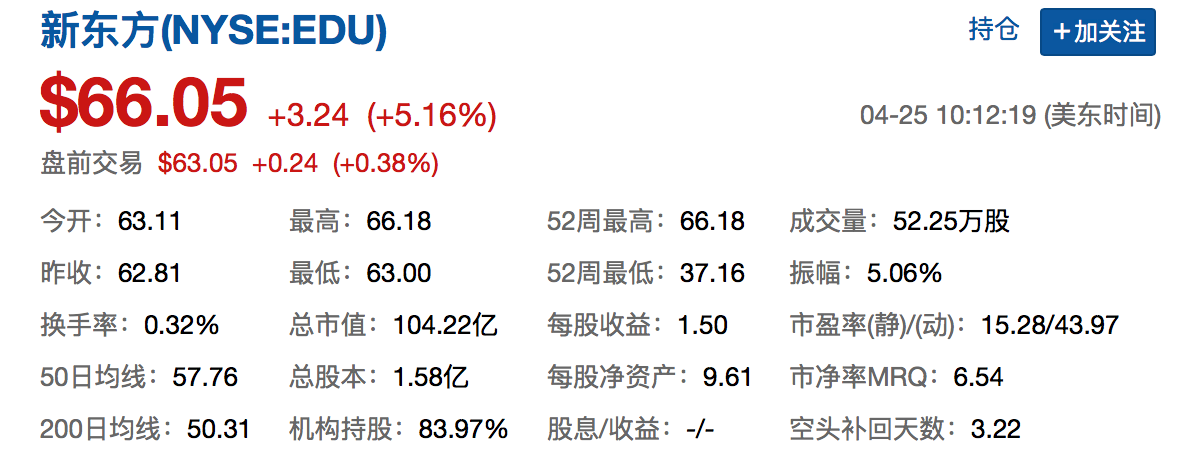 多知網(wǎng)25日消息,截止到發(fā)稿時,新東方股價沖破66美元,市值達104.22億美元。成為首支市值超百億美元的教育股。