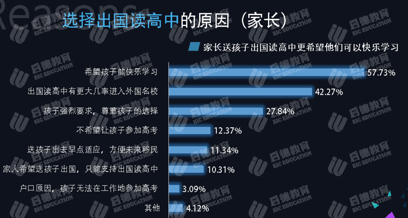 此外,在調(diào)查家長中,42.27%認(rèn)為“出國讀高中有更大幾率進(jìn)入外國名校”、27.84%認(rèn)為“孩子的強(qiáng)烈要求,尊重孩子的選擇”、12.37%表示 “不希望孩子參加高考”、11.34%認(rèn)為“方便未來移民”,這些也是家長們選擇送孩子出國讀高中的原因。