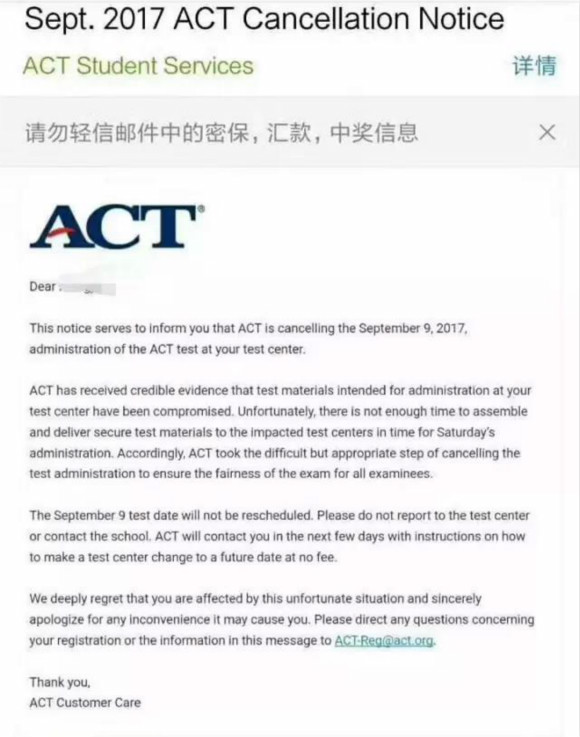 官方郵件表明,2017年9月9日將在部分考場進(jìn)行的ACT考試被取消了,原因為ACT官方收到可靠證據(jù),考場考題被泄漏了,官方?jīng)]有時間重新組織補(bǔ)考,為保障公平性,ACT官方不得不取消部分考場的考試。
