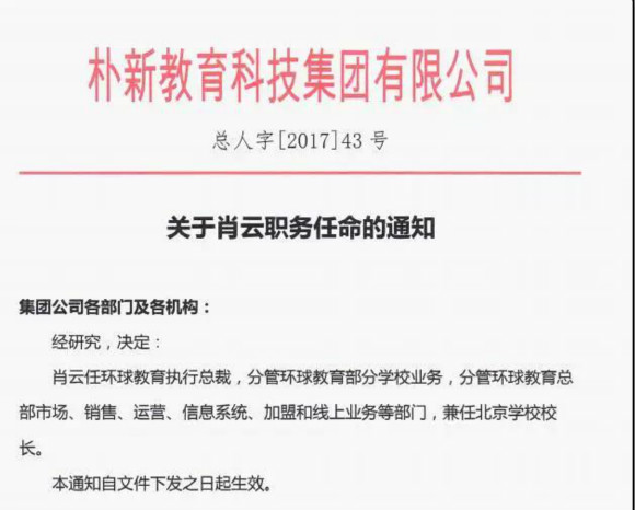 肖云任環(huán)球教育執(zhí)行總裁,分管環(huán)球教育部分學(xué)校業(yè)務(wù),分管環(huán)球教育總部市場、銷售、運(yùn)營、信息系統(tǒng)、加盟和線上業(yè)務(wù)等部門,兼任北京學(xué)校校長;