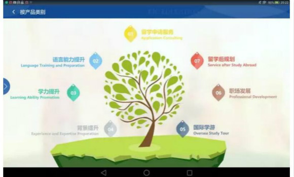 產(chǎn)品地圖模塊則提供“按產(chǎn)品類別”及“按留學時期”兩種搜索思路,幫助顧問更快找到客戶需要的服務(wù)產(chǎn)品介紹。