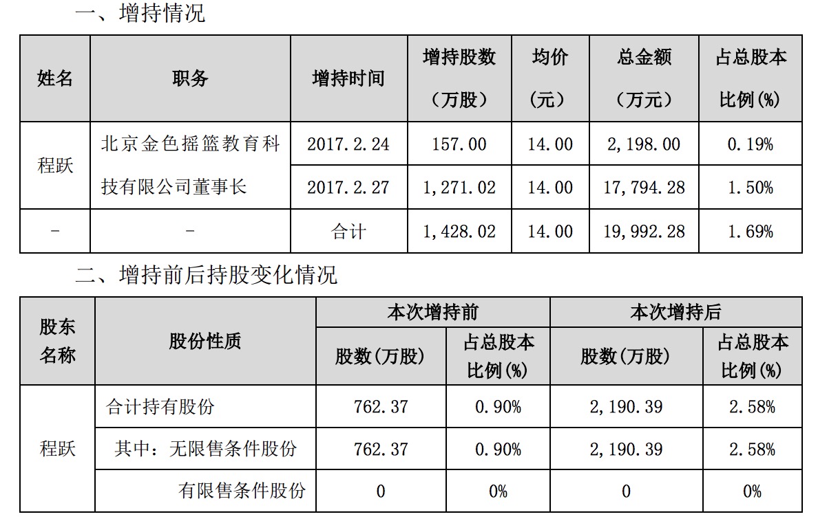 2017年2月28日,程躍通過二級市場累計購買公司股份1800股,成交均價為 14.35元/股,成交總金額為25830元,占公司總股本的0.00021%。