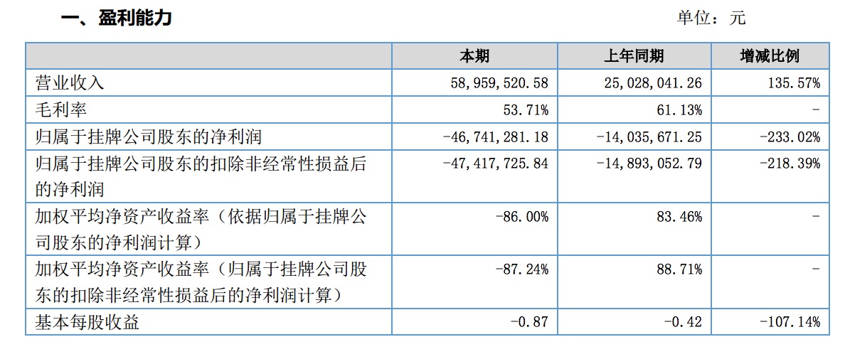 據(jù)報(bào)告顯示,芝蘭玉樹2016年?duì)I收為5895.95萬元,比上年同期的2502.80萬元增長(zhǎng)135.57%;歸屬于掛牌公司股東的凈利潤(rùn)為-4674.13萬元,比上年同期的-1403.57萬元減少233.02%;歸屬于掛牌公司股東的扣除非經(jīng)常性損益后的凈利潤(rùn)為-4741.77萬元,比上年同期的-1489.30萬元減少218.39%。