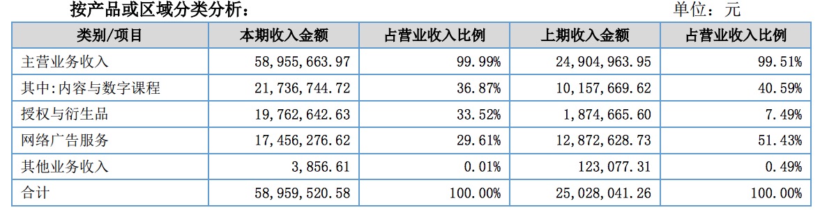 其中,內(nèi)容與數(shù)字課程本期收入 2173.67萬 元,較上期收入 1015.77萬元,增長(zhǎng) 114%;網(wǎng)絡(luò)廣告服務(wù)本期收入1745.63 萬元,較上期收入 1287.26萬 元,增長(zhǎng) 36%;授權(quán)與衍生品本期收入1976.26萬 元,較上期收入187.47萬 元,增長(zhǎng) 954%。