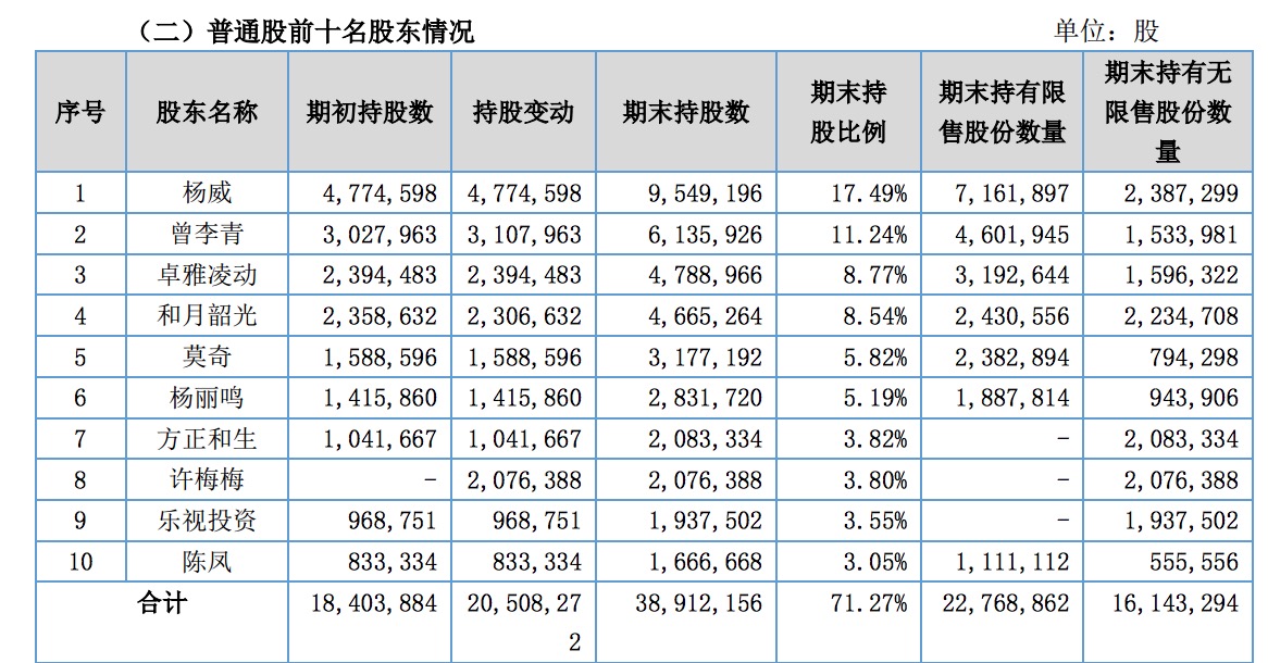 公告顯示,芝蘭玉樹創(chuàng)始人楊威為公司第一大股東,持股比例為17.49%。員工持股平臺(tái)嘉興卓雅凌動(dòng)投資合伙企業(yè)(有限合伙)現(xiàn)持有公司8.77%的股份,其實(shí)際控制人為楊威。楊威與公司股東莫奇、王時(shí)光、賈栩及劉冰分別簽署了《一致行動(dòng)人協(xié)議》(五人共同持有14,872,222股),約定在各方對(duì)有關(guān)公司經(jīng)營(yíng)發(fā)展的重大事項(xiàng)向股東大會(huì)行使何種提案權(quán)和表決權(quán)達(dá)不成一致意見時(shí),應(yīng)以持股數(shù)較多的人的意見為表決意見,即以楊威的意見為表決意見。綜上,楊威通過直接與間接持股,同時(shí)通過與其他股東簽署《一致行動(dòng)人協(xié)議》的方式合計(jì)控制了公 司36.01%的股份,系公司的控股股東及實(shí)際控制人。