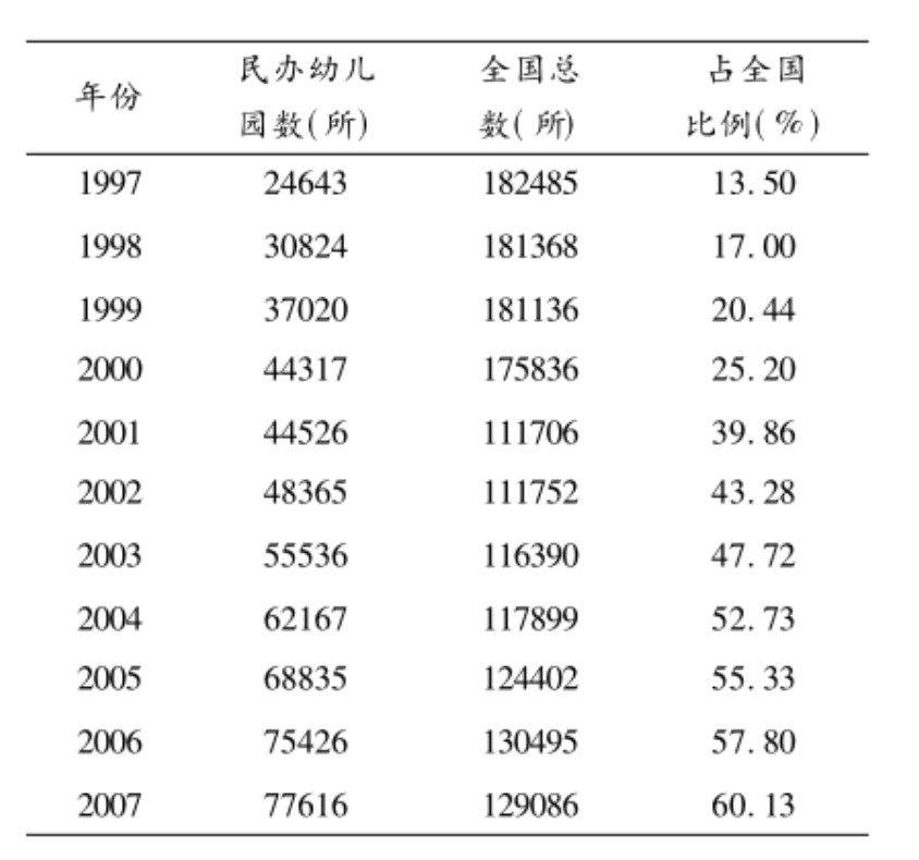 接下來,從1997年-2007年,成為了中國(guó)幼教行業(yè)發(fā)展的“黃金十年”。在這十年內(nèi),根據(jù)教育部統(tǒng)計(jì)的數(shù)據(jù),民辦幼兒園的數(shù)量從占比13%提升到了占比60%。