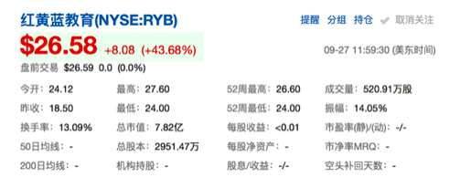 多知網(wǎng)9月27日消息,美國東部時間9點30分,紅黃藍在美國紐交所敲響開盤鐘聲,成為中國首家獨立上市的學前教育企業(yè)。紅黃藍開盤價為24.12美元,截至到11點59分(美東時間)已上漲至26.58美元,較發(fā)行價增長43.68%。
