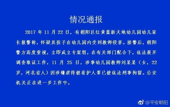 多知網(wǎng)11月25日消息,今日,北京警方公布紅黃藍(lán)新天地幼兒園虐童案調(diào)查結(jié)果表示,涉事幼兒園教師劉某某(女,22歲,河北省人)因涉嫌虐待被看護(hù)人罪已被依法刑事拘留。公安機(jī)關(guān)正在進(jìn)一步工作中。