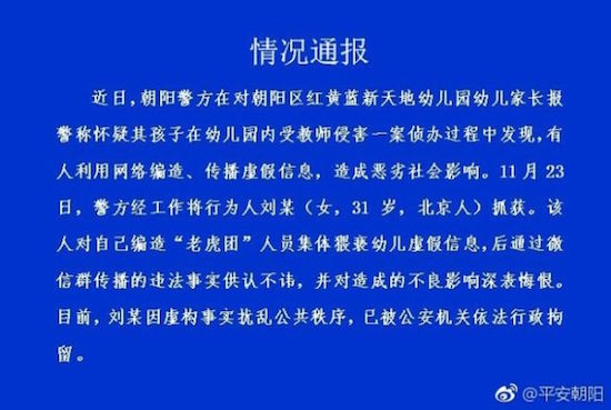 警方在調(diào)查中發(fā)現(xiàn),有人利用網(wǎng)絡(luò)編造、傳播虛假信息,造成社會(huì)惡劣影響。11月23日,警方已經(jīng)將行為人劉某(女,31歲,北京人)抓獲。目前,劉某因虛構(gòu)事實(shí)擾亂公共秩序,已被公安機(jī)關(guān)依法行政拘留。