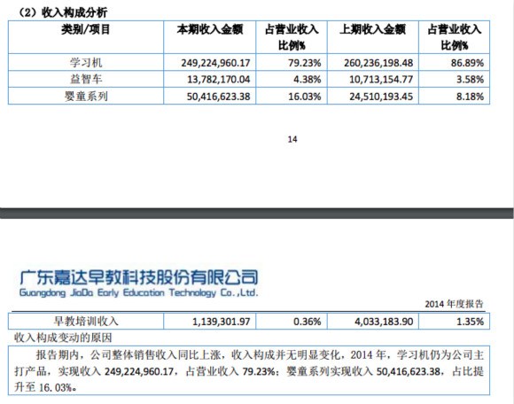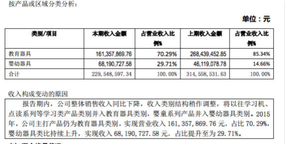 而更讓嘉達(dá)早教感受到寒意的,是主打產(chǎn)品營收額的大幅下滑。財報顯示,2015年,嘉達(dá)早教包括學(xué)習(xí)機(jī)、點讀系列的教育器具類產(chǎn)品,銷售額為1.61億元,與去年同期相比,減少了1.07億元,減少比例為66.46%。
